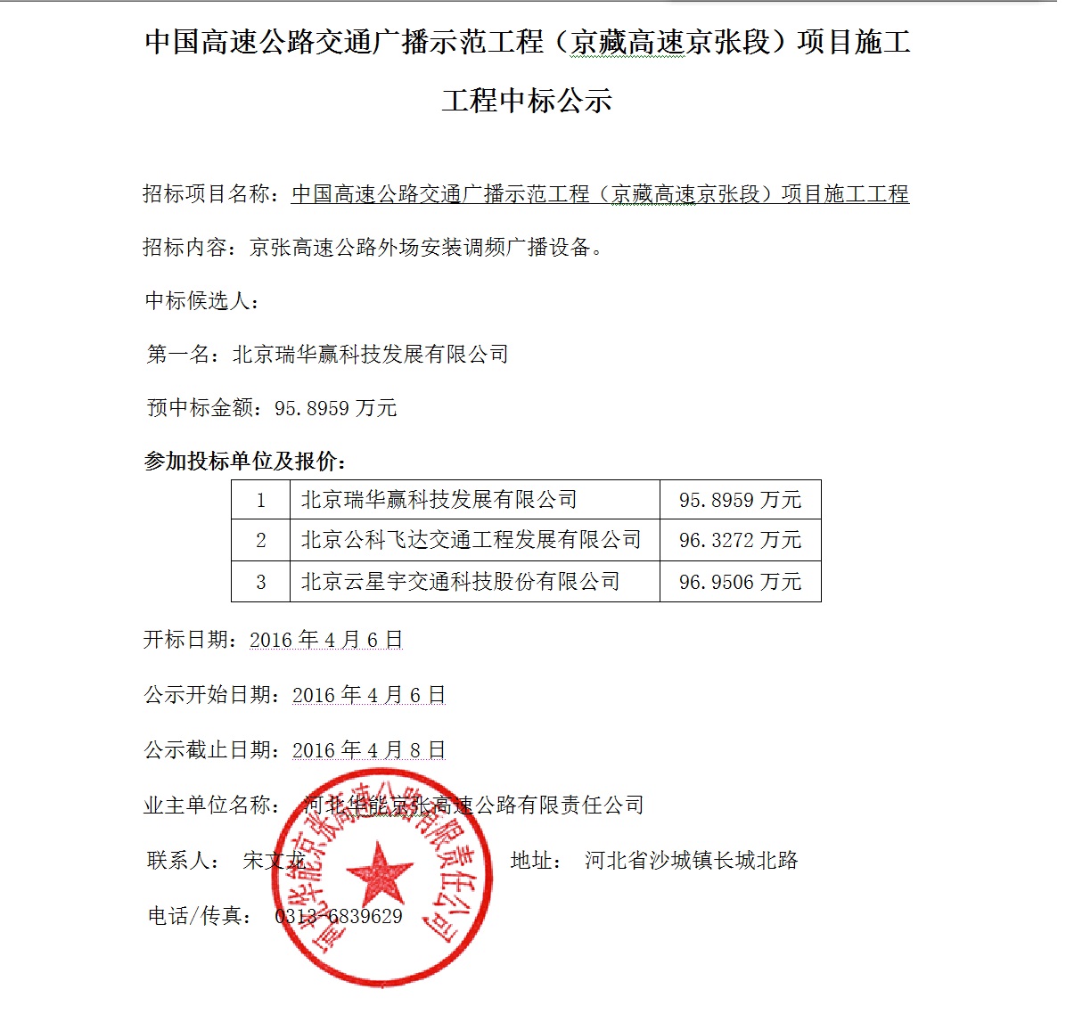高速?gòu)V播工程中標(biāo)公示