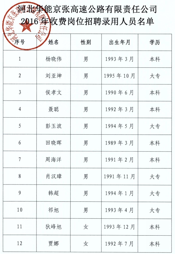 2016年收費(fèi)崗位招聘錄用人員名單