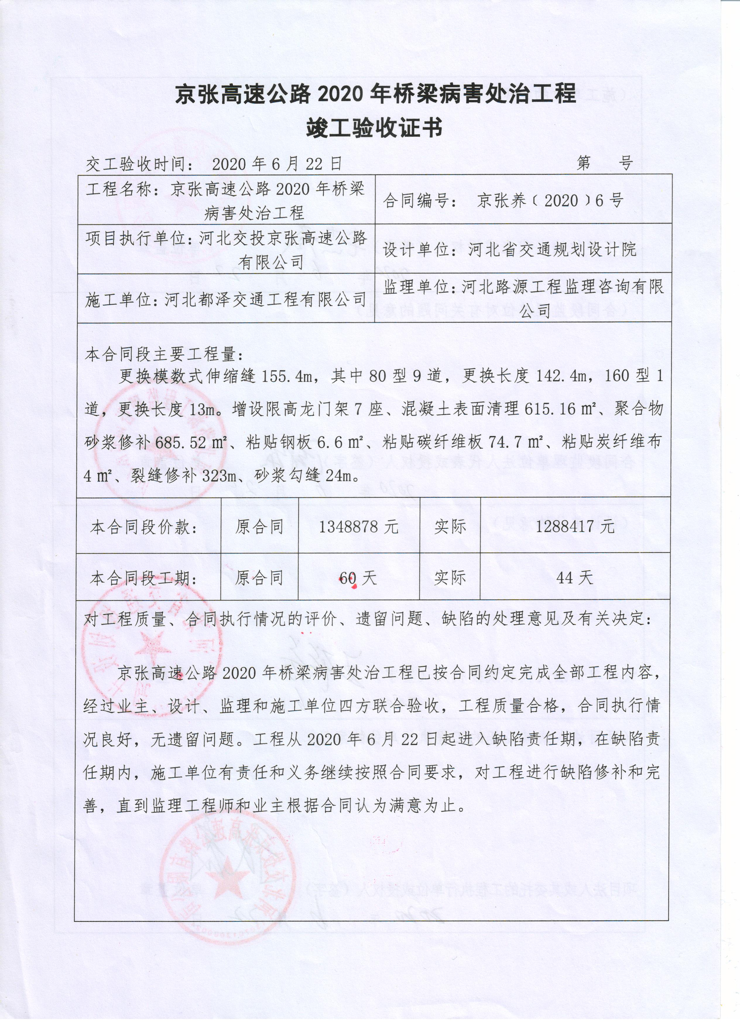 京張高速公路2020年橋梁病害處治工程竣工驗(yàn)收證書